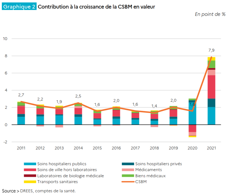 L’année 2021 marque une croissance inédite de la CSBM à +7,9%, après une année 2020 relativement modérée (+1,6%) en raison des confinements successifs. Cette explosion des dépenses due en partie au Rac0 (le dentaire représente 1,2 point de croissance de la CSBM) s’explique par un rattrapage de soins sur d’autres prestations. Voici les 2 grands ensembles de prestations qui impactent fortement la CSBM.