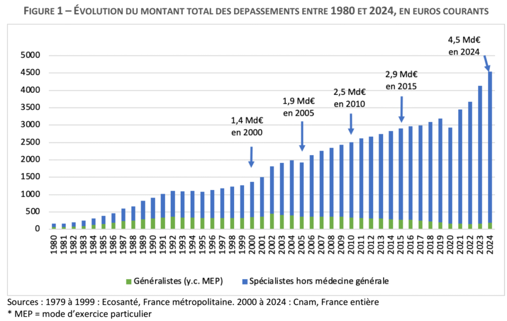 Depuis 1980, le HCAAM note une progression quasiment ininterrompue des hausses des dépassements d’honoraires chez le médecin. Hormis les creux notables de 2005 et de la crise sanitaire de 2020, chaque année a vu le montant des dépassements augmenter. Ils atteignent ainsi 4,5 Md€ en 2024, soit une progression de 1,6 Md€ en 9 ans. Pour comprendre pourquoi une telle hausse est remarquable, il faut avoir conscience qu’entre 2000 et 2015 le montant total des dépassements d’honoraires n’a progressé « que » de 1,5 Md€.