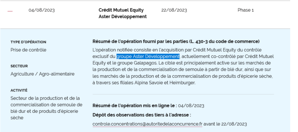 C’est le groupe Aster Développement qui devrait passer sous le contrôle intégral de Crédit Mutuel Equity. Actuellement, cette société est également co-contrôlée par le groupe Galapagos. Ce projet est signalé depuis le 4 août 2023 et donne aux tiers jusqu’au 22 août 2023 pour transmettre leurs observations.