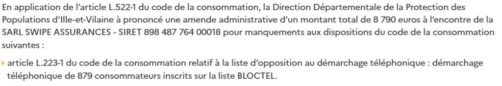 C’est le courtier Swipe Assurances qui écope d’une amende administrative de 8 790 €. Cette amende est infligée après que ce courtier a démarché 879 personnes pourtant inscrites sur la liste BLOCTEL. Cette sanction intervient 3 mois après la précédente sanction du même type qui concernait un courtier de Haute-Garonne.