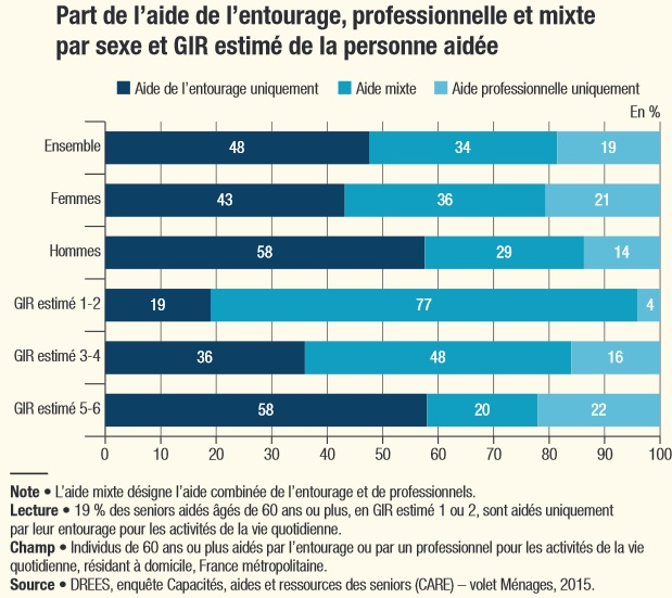 L’une des données essentielles de l’étude concerne le type d’aide que reçoivent ces 3 millions de personnes : sans leurs proches, leur vie quotidienne serait bien plus difficile. En effet, une personne sur deux en situation de dépendance à domicile ne reçoit que l’aide de son entourage.