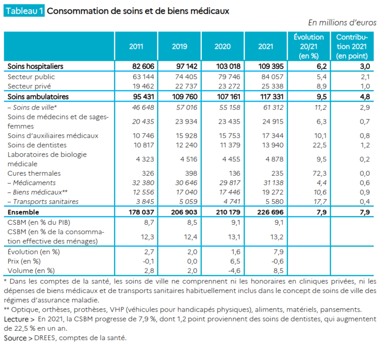L’étude annuelle dédiée aux dépenses de santé pour 2021 vient d’être publiée par le ministère de la santé. La direction de la recherche, des études, de l’évaluation et des statistiques (Drees) y confirme la hausse inédite de la consommation de soins et de biens médicaux (CSBM). Cette hausse de 7,9% (soit 16,5 Md€) est notamment due à l’application de la réforme du Rac0, en dentaire et auditif, qui pèse en grande partie sur les organismes complémentaires d’assurance maladie (Ocam).
