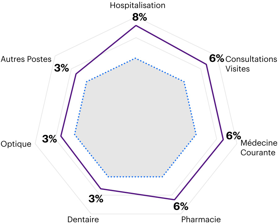 – Les consultations, la médecine courante et la pharmacie (+6 %) : des postes fortement impactés par les nouvelles conventions médicales et l’évolution du calendrier vaccinal.
