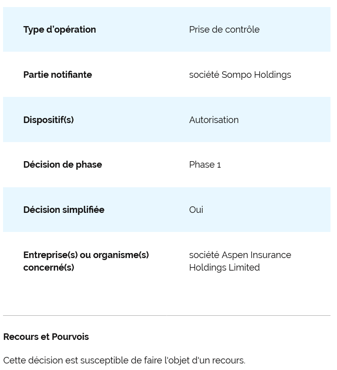 L’autorisation de phase 1 permet ainsi à Sompo Holdings, Inc., propriétaire d’Endurance Specialty Insurance Ltd., de prendre le contrôle d’Aspen Insurance Holdings Ltd. pour 3,5 Md$.