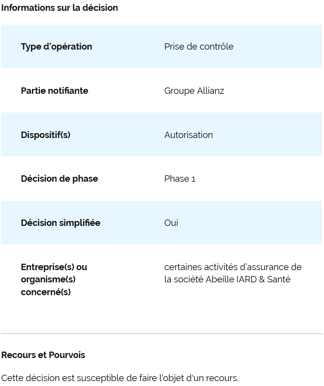 Cette marque appartenait jusqu’ici à Abeille IARD & Santé (Aéma Groupe). Elle regroupe les activités d’assurance automobile, accidents de la vie, habitation et protection juridique. Retrouvez cette décision d’autorisation de phase 1 ci-dessous :