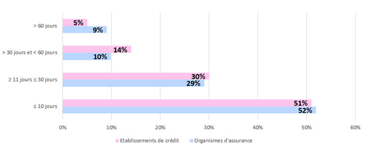 La grande majorité des acteurs interrogés répond à au moins 70% des réclamations sous trente jours. Cela peut s’expliquer par la fixation par nombre d’acteurs d’objectifs internes plus ambitieux que les bonnes pratiques recommandées. En assurance, les réclamations traitées dans un délai supérieur à deux mois concernent seulement quelques organismes.