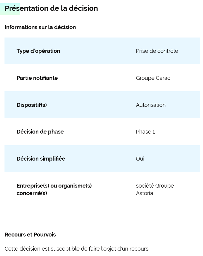 Deux mois après l’officialisation du projet de prise de contrôle du groupe Astoria par le groupe CARAC, l’Autorité de la concurrence vient de donner son accord.