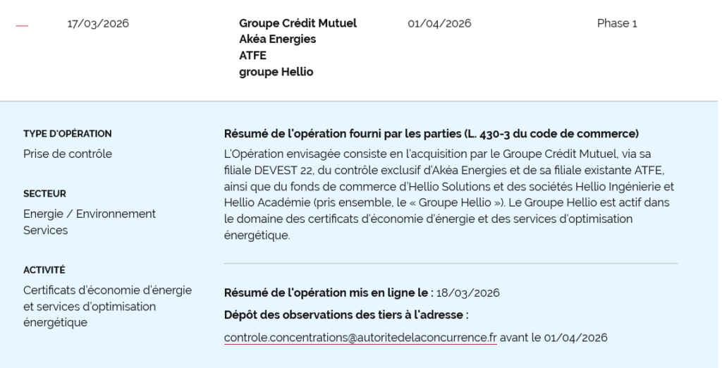 Si l’opération est conclusive, c’est la filiale du Groupe Crédit Mutuel appelée DEVEST 22 qui prendra le contrôle exclusif des sociétés Akéa Energies, de sa filiale ATFE, et du Groupe Hellio. Akéa et sa filiale sont spécialisées dans l’accompagnement à la performance et la maîtrise énergétique. Quant au Groupe Hellio, composé de Hellio Solutions, Hellio Ingénierie et Hellio Académie, il est spécialisé dans les certificats d’économie d’énergie et les services d’optimisation énergétique. Tous les tiers ont jusqu’au 1er avril 2026 pour envoyer leurs observations à l’Autorité de la concurrence.