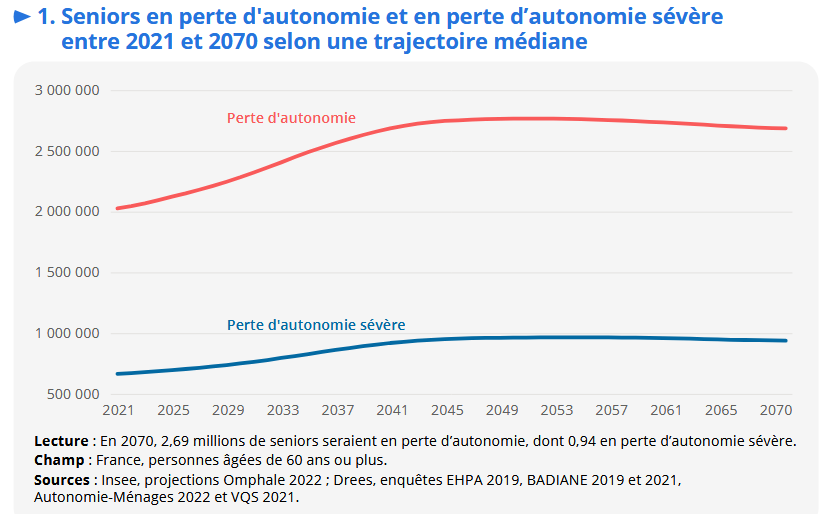 D’après les perspectives publiées par l’Insee et la Drees, la France devrait compter près de 2,8 millions de seniors en perte d’autonomie contre un peu plus de 2 millions aujourd’hui.