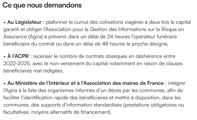 En plus d’un plafonnement des cotisations pouvant être récoltées à 2 fois le capital garanti (ce qui est déjà bien !), les associations demandent à l’ACPR de lister les contrats en déshérence dont le capital n’a pas été versé. Ce deuxième point permettrait de savoir exactement quelles sont les sommes restées captives des contrats obsèques non-liquidés malgré le décès de la personne assurée. C’est étroitement lié à la volonté d’impliquer davantage l’Agira dans le processus d’information des opérateurs funéraires, des bénéficiaires d’un contrat, puis dans la boucle d’information des communes, est une proposition intéressante pour faciliter la circulation de l’information et le déclenchement des contrats obsèques.