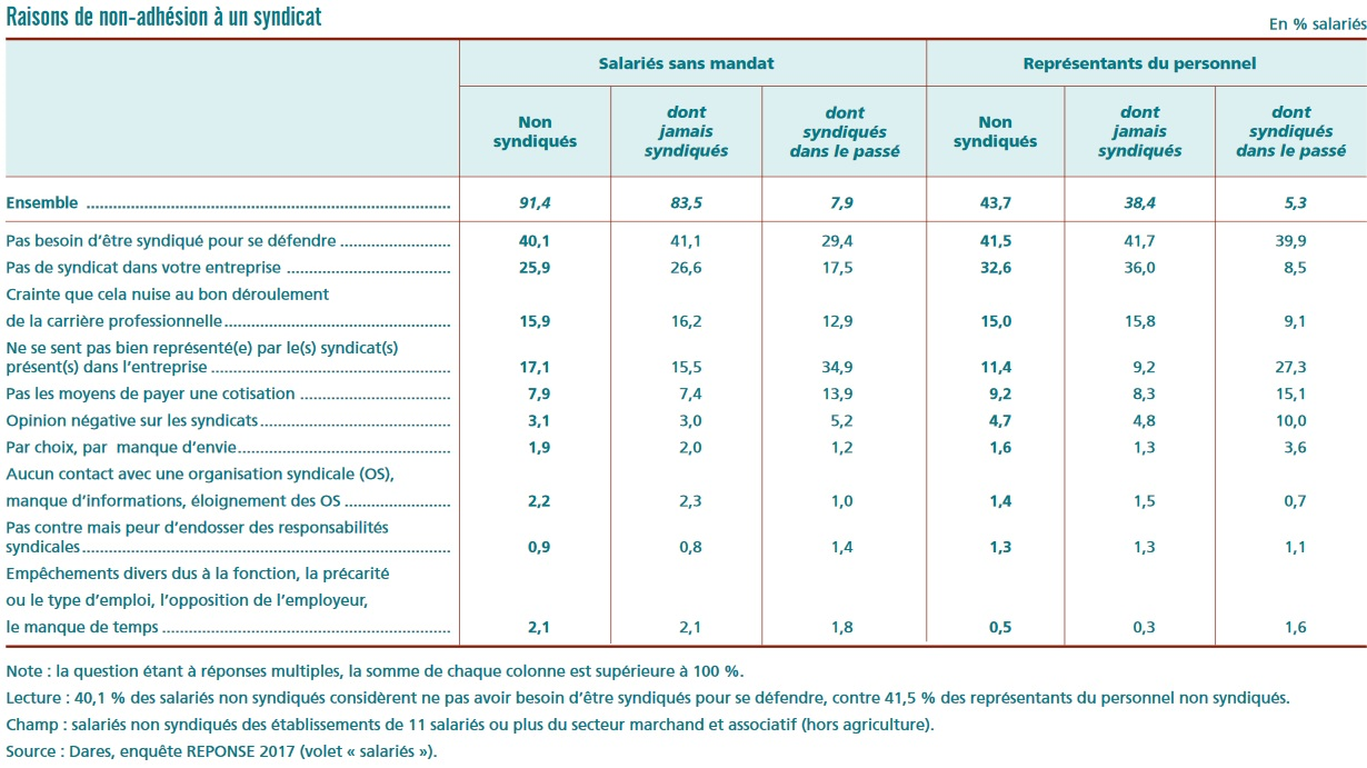 Le document publié par le service statistique du ministère du travail se base sur des données de 2017. Il détaille les raisons pour lesquelles les représentants du personnel n’adhèrent pas à un syndicat. On comprend ainsi mieux comment les syndicats de salariés sont perçus.